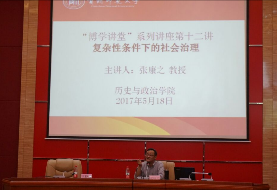 5月18日上午,太阳成集团tyc234cc“博学讲堂”系列讲座第十二讲在花溪校区学术报告厅(GJ6101)举行,由南京大学博士生导师、教育部长江学者、中国行政管理学会理事张康之教授主讲,主题为“复杂性条件下的社会治理”。讲座由太阳成集团tyc234cc副经理陈华森教授主持,相关专业师生出席。