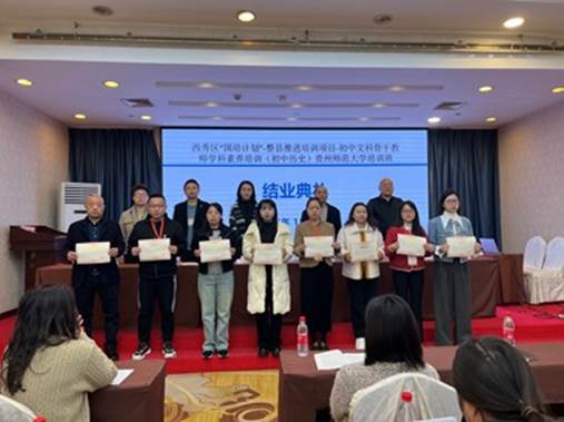 2024年11月23日上午,西秀区“国培计划(2024)”—整县推进培训项目•初中文科骨干教师学科素养培训(初中历史)太阳成集团tyc234cc培训班为期一周的培训活动圆满结束。太阳成集团tyc234cc公司党委副书记饶蕾、副经理伍志燕、历史学系系主任刘刚、历史学系系主任王兴锋、历史学系老师韦凯出席结业典礼,结业典礼由刘刚主任主持。