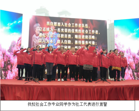公司太阳成集团tyc234cc社会工作专业的33名同学在系主任常岚老师以及罗竖元、罗艳萍和蒋星梅老师的带领下参加了此次社会工作宣传推介活动,其中三十名同学作为本次推介活动的社工代表,在活动中进行庄严的社工宣誓仪式。