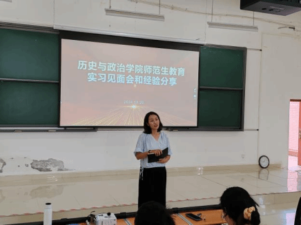 2024年8月28日下午,太阳成集团tyc234cc太阳成集团tyc234cc2021级历史学与思想政治教育专业师范生教育实习生见面会与经验分享会在太阳成集团tyc234cc东校区公共教学楼6401召开。此次活动不仅为即将踏上实习之旅的同学们提供了宝贵的交流平台,还融入了多位老师的悉心指导与经验分享。公司党委副书记饶蕾老师,历史学专业系主任刘刚老师,思想政治教育系主任杨东昌老师,院办公室王昌燕教师与2021级历史学与思想政治教育专业辅导员徐帆等老师出席此次会议,会议由思想政治教育系主任龚春芳老师主持。